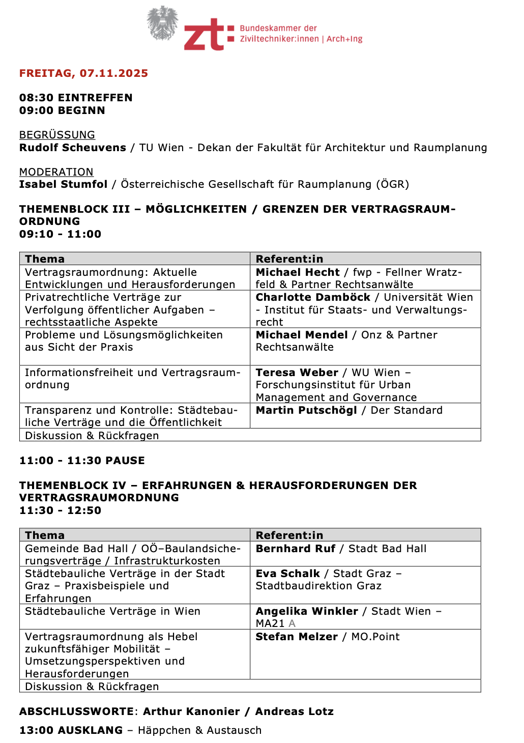 Die Veranstaltung bot Raum für fachlichen Austausch und Diskussion über Chancen und Grenzen dieses Instruments der Raumplanung und zeigte, wie Vertragsraumordnung zur aktiven Gestaltung von Siedlungs- und Entwicklungsprozessen beitragen kann.